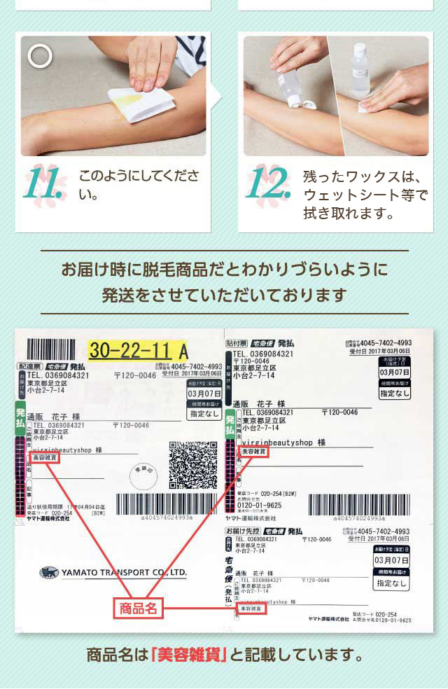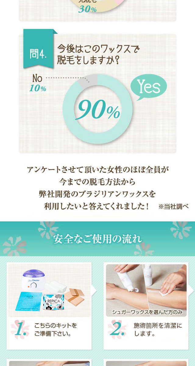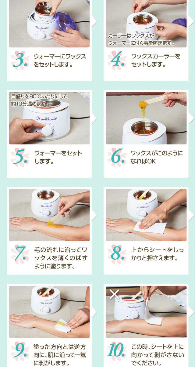 ・ 脱毛箇所に日焼けやニキビ、怪我などが無いことを確認してください。また、過去2週間以内にレーザーやピーリングなどの処置をしていないことを確認してください。