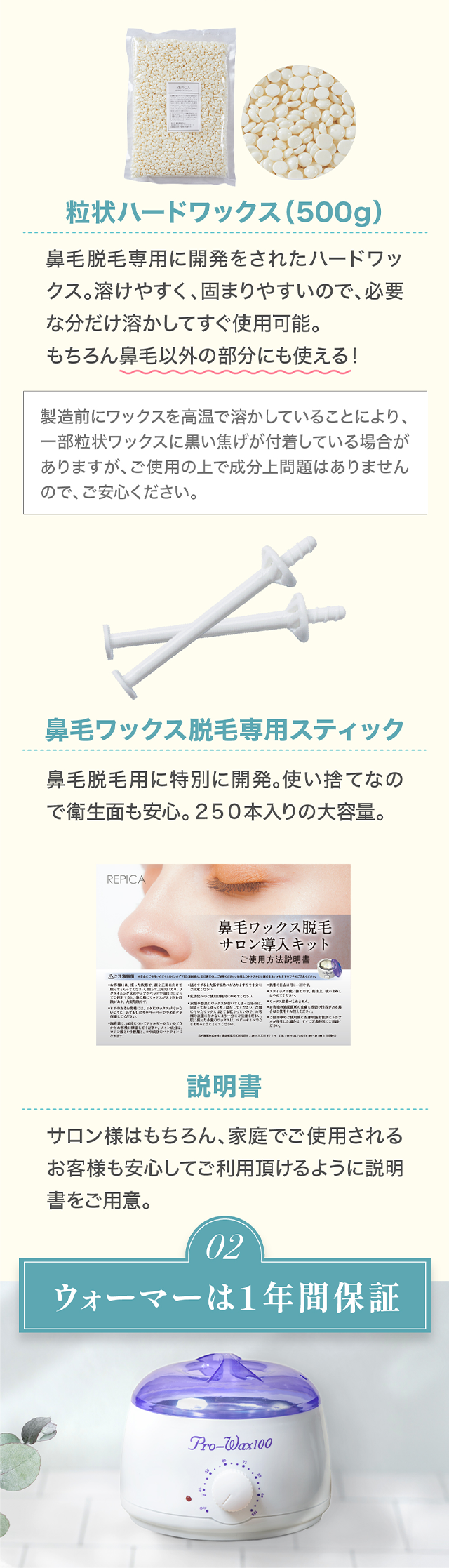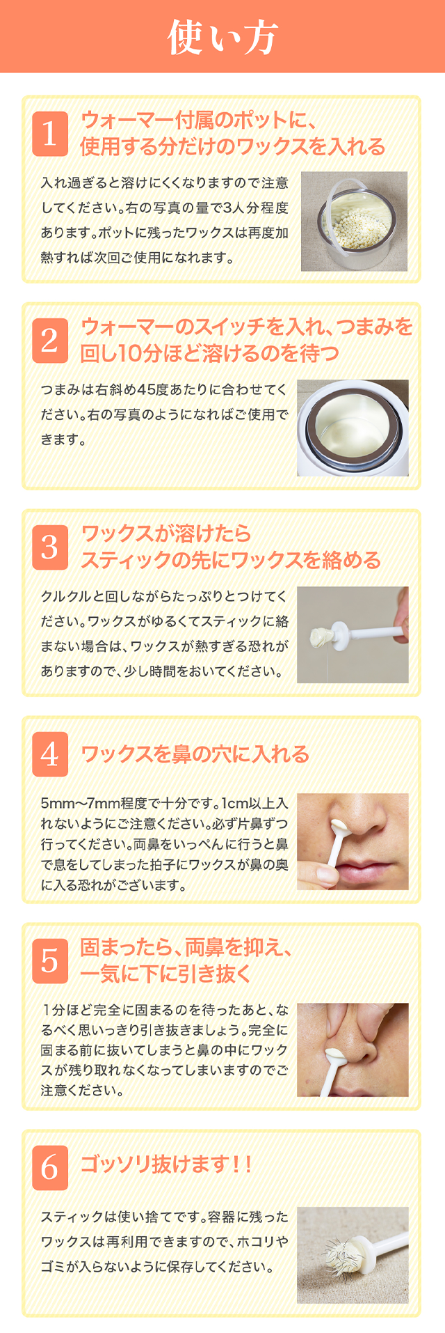 | 【ご使用上の注意】 | ・当製品はロジン(松ヤニ)を使用しております ・本製品は脱毛のための製品です。目的以外の用途では使用しないでください。ご使用前に皮膚の状態を確認してください。 ・使用の際には、必ずパッチテストを行い異常がないことを確認してください。 ・肌に傷や腫物等異常がある場合は使用しないでください。 ・皮膚科等で治療を受けている場合は使用しないでください。 ・肌に異常が現れた場合は直ちに使用を中止し、医療機関にご相談ください。 ・ワックスが髪やヒゲにつかないように注意してください。 ・ご使用前にオリーブオイルやベビーオイルを鼻の穴のふちに薄く塗るとお肌の保護になります。 ・安定した掃除のしやすい台の上でご使用ください。 ・熱に弱いものの上には置かないでください。変形する恐れがあります。 ・鼻毛専用スティックなど、粒ワックス以外のものと一緒に温めないでください。 ・カーペットや衣類など、布製品に付着したワックスは取れません。ご使用の際には十分ご注意下さい。 ・口に入れないでください。口、目に入ったときはすぐに洗い流してください。 ・お子様やペットの手の届かない場所で使用および保管してください。 ・ウォーマーでワックスを温めすぎるとやけどする恐れがございます。ご使用の際は十分にご注意の上、自己責任でご使用ください。 ・直射日光、高温多湿の場所を避け冷暗所で保管してください。 |
