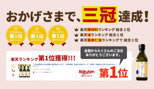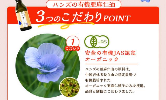 ■アマニ油の魅力■・亜麻仁油(あまにゆ)は必須脂肪酸であるα−リノレン酸を豊富に含み、このα−リノレン酸が体内に入ることで、オメガ3脂肪酸(DHA/EPA)に変換され、頭をクリアにさせる効果が期待できることから"脳の栄養素"とも言われる健康油です。・元気な体作りにはオメガ3(魚に多く含まれる)やオメガ6(お肉/揚げ物に多く含まれる)と呼ばれている必須脂肪酸が大切なのですが、近年は食生活の変化などでオメガ6に偏っている人が多くなってしまったため、オメガ3(α-リノレン酸)を摂れるアマニオイルを意識的に摂取することが大切です。オメガ3系脂肪酸のオイルには、体の中をサラサラにしたり、体の錆びを抑えたり、正常な数値へと促す効果も期待でき、生活習慣病を心配している方にもおすすめのオーガニック油です。・ハンズの有機アマニ油は農薬/化学溶剤/添加物/保存料は一切不使用で有機肥料を使用した、有機JAS認証のオーガニックアマニ油となっています。・オーガニック亜麻仁種子のみを一番絞りしたエクストラバージンオイルは、コールドプレス製法の非加熱で抽出することで栄養素を損なわず抽出された無添加アマニ油です。