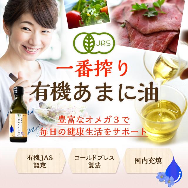 - アマニ油初めて飲みました。朝夕毎日飲むと、お肌きれいになり、生活習慣病とかの予防になると、TVのトリセツで放送していたので、色々ある中で、オーガニックのこちらのアマニ油を購入しました。ヨーグルトやサラダ、刺身とかにかけてもいいらしいですが、直に飲んでも個人的には大丈夫でした。