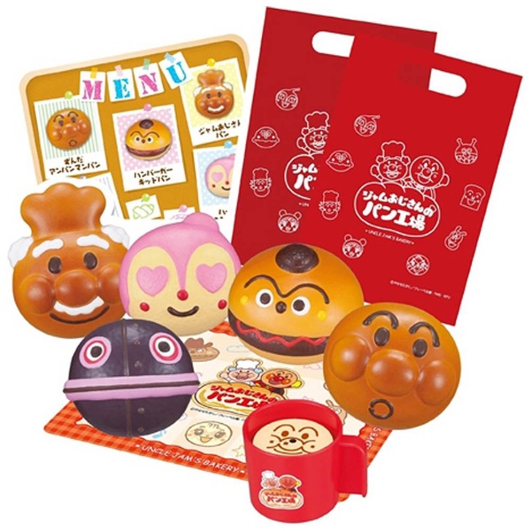 「ジャムおじさんのやきたてパン工場」に新しいキャラクターパンが仲間入り!ずんだアンパンマンパン・ジャムおじさんパン・ハート目ドキンちゃんパン・ハンバーガーキッドパン・だだんだんパンの5種類のキャラクターパンと、ショップバッグ、アンパンマンラテとカップ、ランチシートのセット。パンセットだけでもお店屋さんごっこ遊びができるよ。