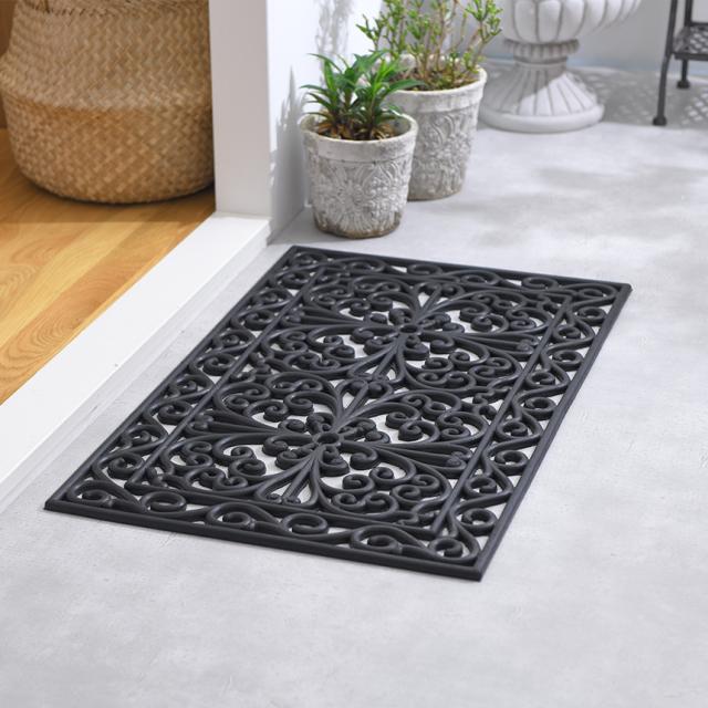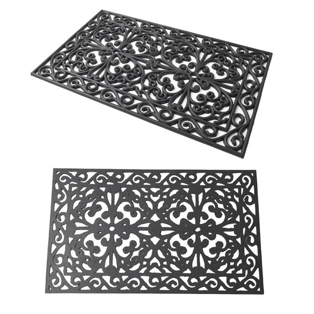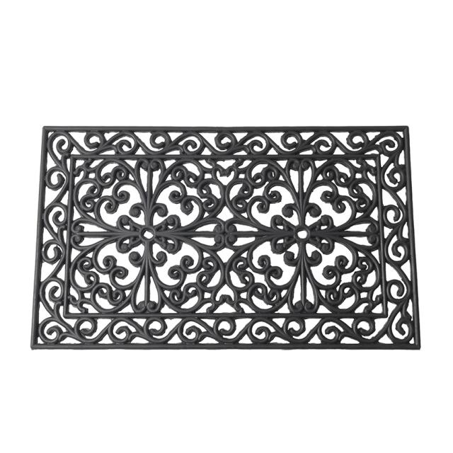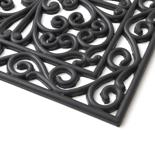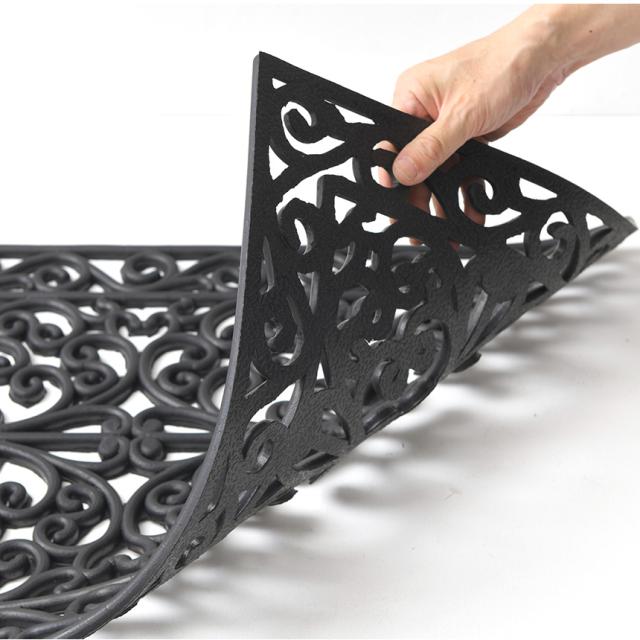 備考:イタリアVELCOC社の屋外用玄関マット。玄関、入り口に置くだけ。まるでアイアン(鉄製)のように高級感を演出してくれます。お手入れは簡単、汚れたらお手入れは簡単、さっと水洗いをしてください。全体がゴムでできているため滑りづらい仕様。アラベスク模様のデザインが強風も上手にしのいでくれるので、風で飛びづらい仕様です。※雨などで濡れたり、水洗い後は陰干しをしてください