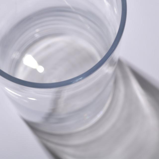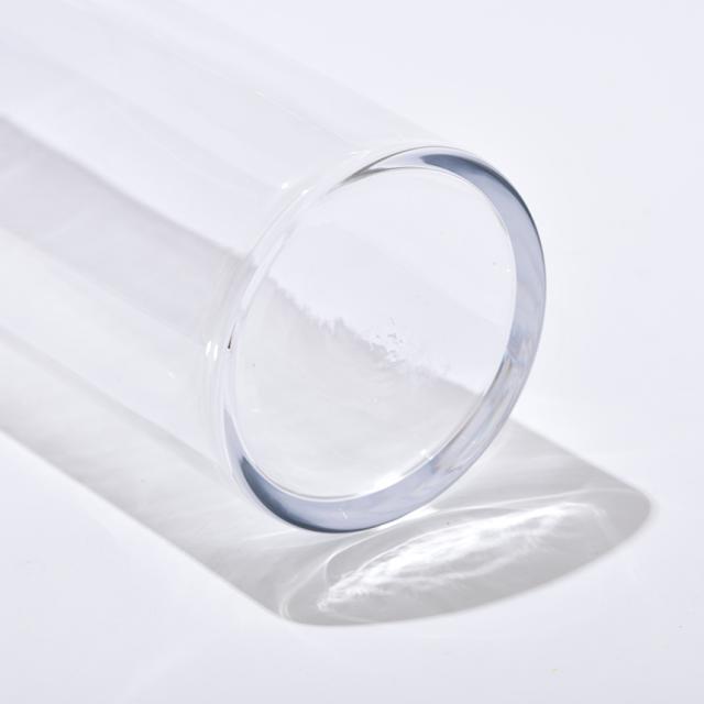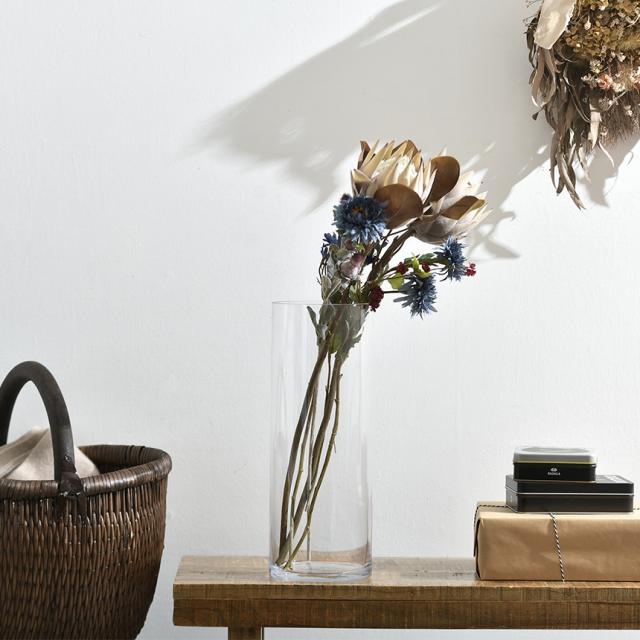 シンプルなシリンダー(円筒)タイプのガラス花瓶。活けた花の茎や葉の美しさも映えるクリアなガラスのフラワーベースで、ミニマルなデザインが活けた植物そのものを引き立てます。