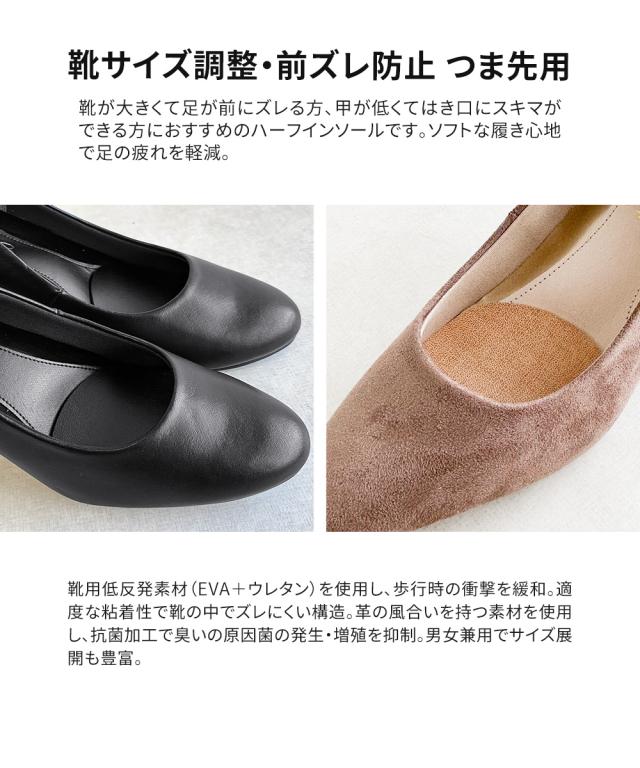 靴サイズ調整 インソール つま先用 男女兼用 靴が大きい 前ズレ防止 衝撃吸収 疲労軽減 抗菌加工 革風素材 EVA ウレタン 低反発素材 滑り止め 洗濯不可 日本製 レギュラー ラージ 薄型 クロ ベージュ スエード 快適フィット 靴中敷き 靴のスキマ調整 甲低い対策 靴のフィット感改善