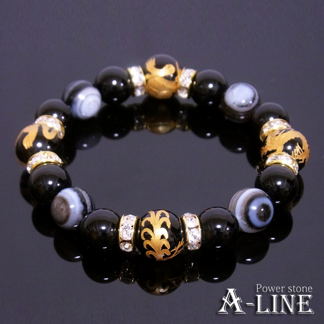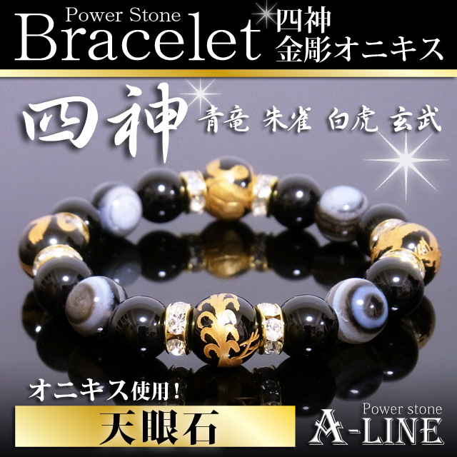 パワーストーン ブレスレット 金運UPに 四神金彫りオニキス12mm&天眼石&オニキス10mm PW-3221