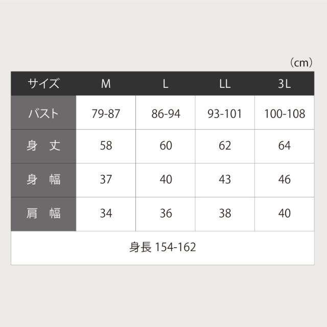 ■サイズ:M/バスト79-87、身丈58、身幅37、肩幅34、L/バスト86-94、身丈60、身幅40、肩幅36、LL/バスト93-101、身丈62、身幅43、肩幅38、3L/バスト100-108、身丈64、身幅46、肩幅40cm