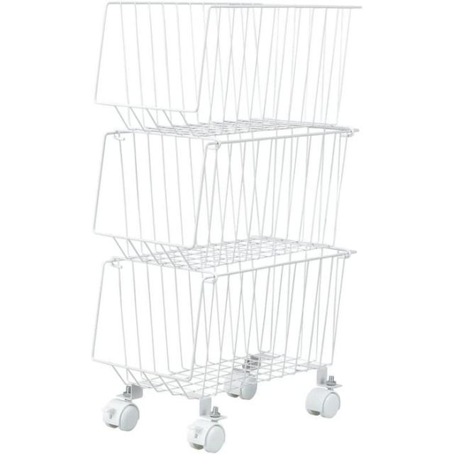 スタッキング式3段マルチ収納バスケット スリム (ホワイト) ワイヤーバスケット スタッキングワゴン 便利な収納ラック