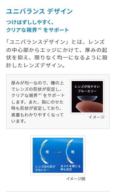 レンズの厚みを限りなく均一にすることで、まばたきをした時もレンズの形状を正しく保ち、一日中クリアな視界が続きます。
