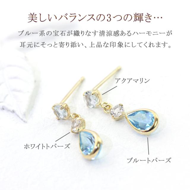 | 地金・素材 | ・ブルートパーズ ペアーカット ・アクアマリン ラウンドカット ・ホワイトトパーズ ラウンドカット ・地金:K18YG(18金イエローゴールド) ・ダブルロック キャッチ ※刻印箇所等は画像と異なる場合がございます。 |