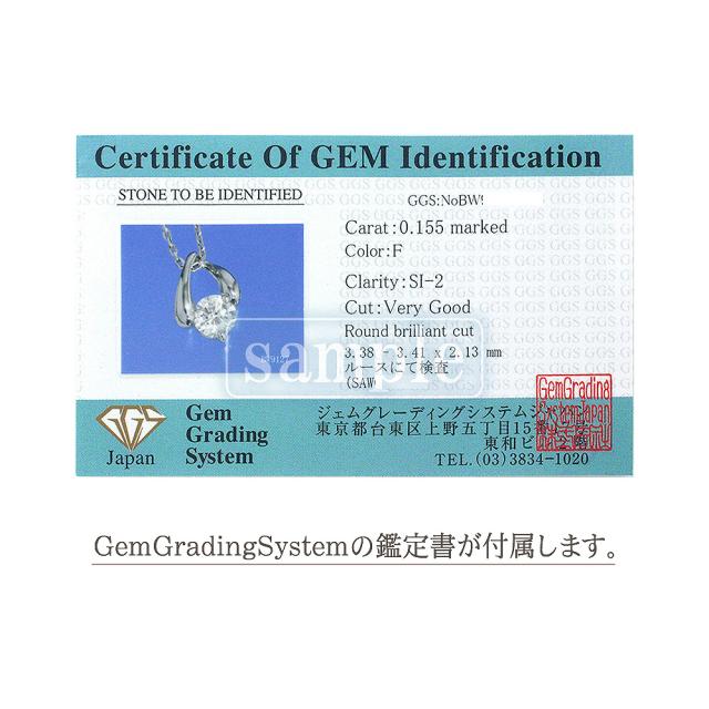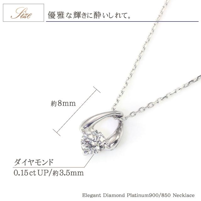 | 地金・素材 | ・天然ダイヤモンド ラウンドブリリアントカット(鑑定書付き) カラット:0.15ct up カラー:G up クラリティ:SI-2 up カット:Good up ・地金:プラチナ Pt900(トップ)、Pt850(チェーン)※強度を上げるため、チェーンにはPt850を使用しています。 |