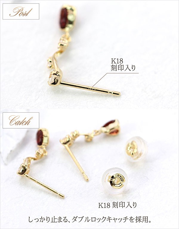 | 地金・素材 | ・ガーネット ペアーシェイプカット ・スーパーキュービックジルコニア ・地金:K18YG(18金イエローゴールド) ・ダブルロック キャッチ |