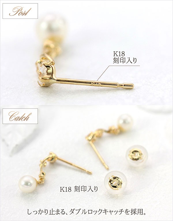 | 地金・素材 | ・淡水パール ・スーパーキュービックジルコニア ・地金:K18YG(18金イエローゴールド) ・ダブルロック キャッチ |