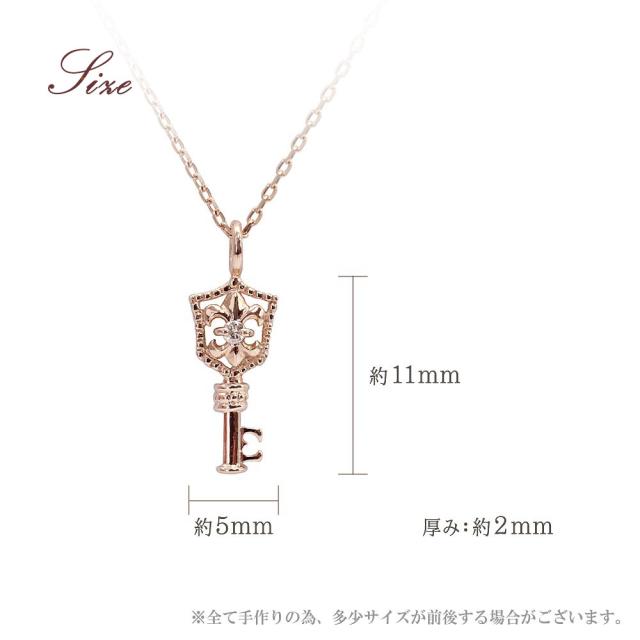 | サイズ | ・ネックレス:約40cm(女性標準サイズ) (約37cm部分にアジャスターカン付き/37cmでもご使用頂けます。) ・鍵:縦11mm×横5mm、厚み:最大約2mm ※手作りの為、多少サイズが前後する場合がございます。 |