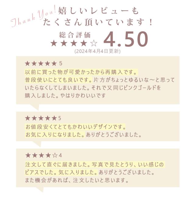 - 何度も ピンクゴールドを購入しています。たまに ゆるい感じのが あるので落としてくる時があるのですが そのたびに購入しています。お値段も 安いから でも普段使いにお値段以上でかわいいから 私のお気に入...