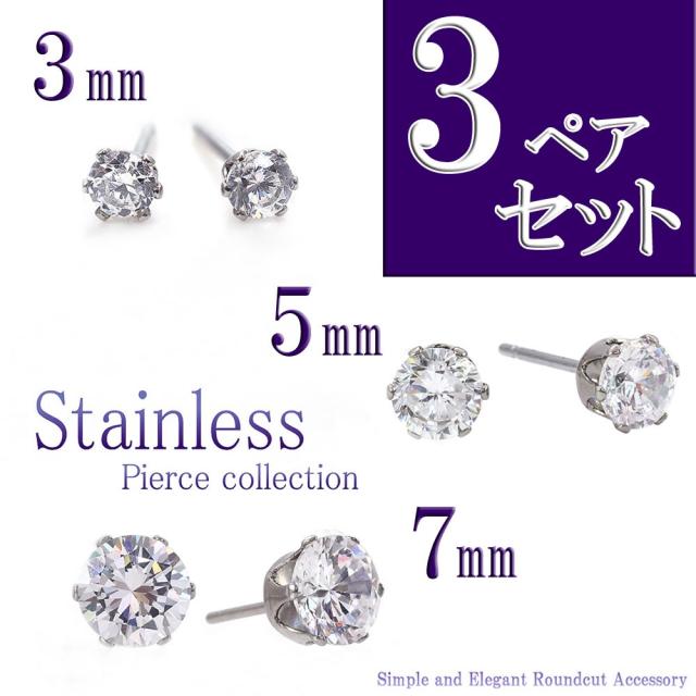 上質なジルコニアを使用したシンプルピアス。石の直径が3mmと5mmと7mmの3ペアのセット商品です。