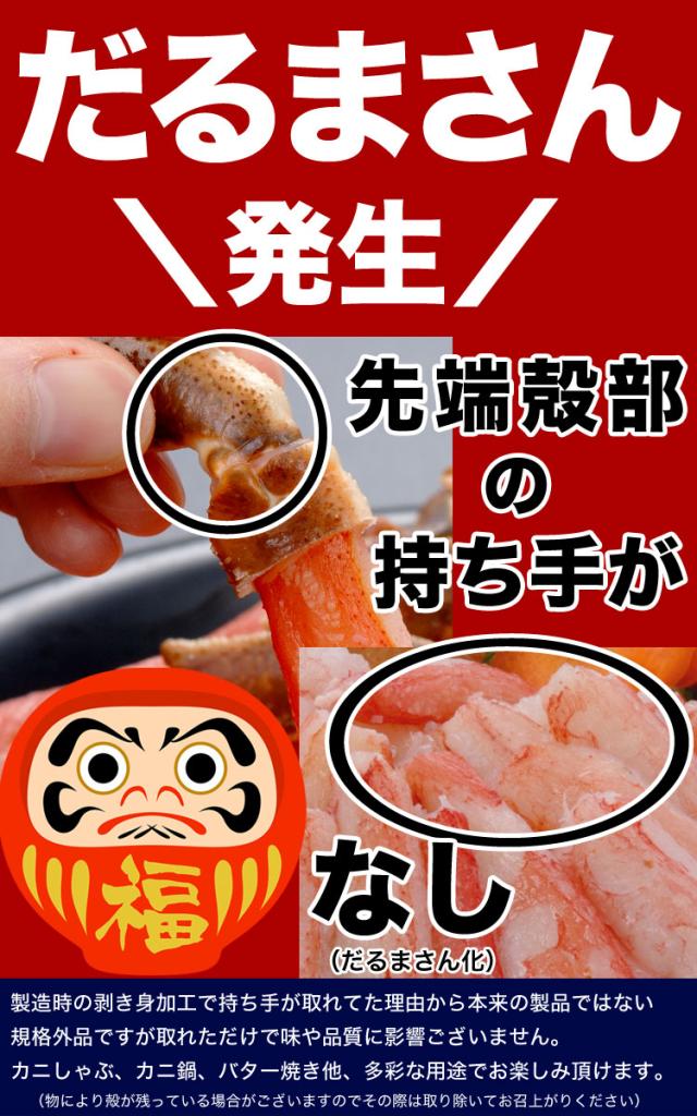 - 4人家族で2パック購入しました。 おまけも豪勢で大満足の蟹鍋となりました。 蟹の旨味がしっかり感じられ、火を通すと棒肉の身がふわっとふくらんで大変美味しかったです。 是非また購入させて頂きます。 有り...