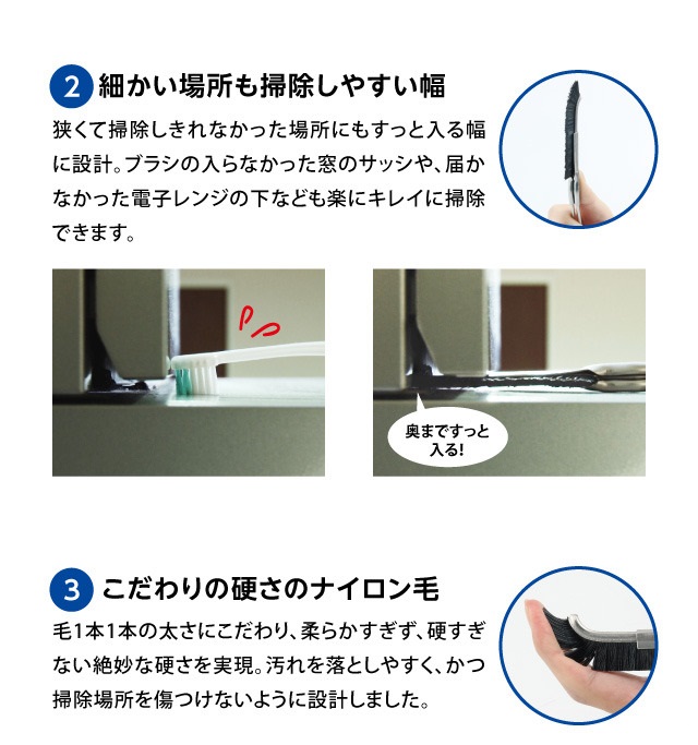 細かい隙間や角にもしっかりフィットし、汚れをかき出します。