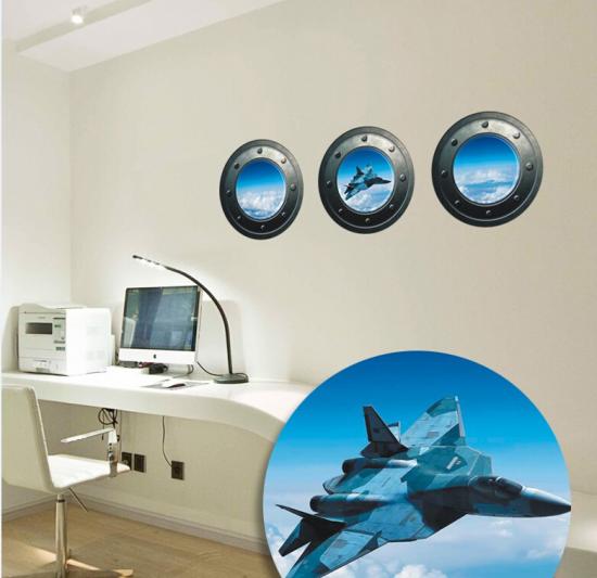 ウォールステッカー 3D窓から 戦闘機 青空 壁シール トリックアート お得な3枚セット かっこいい 飛行機 貼り直せる ウォールシール