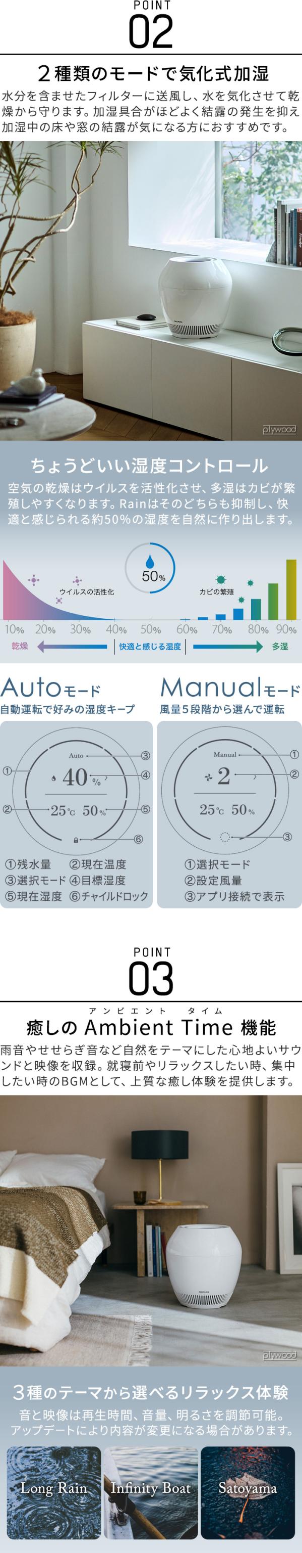 Rainは画期的なタンクレス構造を実現した美しい加湿器。BALMUDA社の発売から10年以上、多くの方に愛され、家電らしからぬ美しいデザインと、水を注ぐ心地よい体験はそのままに、新たに自然をテーマにした心地よいサウンドと、ディスプレイに流れる映像、やわらかい光の組合せにより、落ち着きの時間をお届けするAmbient Timeを搭載し、より快適で上質な加湿体験へと進化しました。加湿方式はもっとも自然な気化式。乾燥する季節を健康的に過ごすために。清潔で、適切な湿度を提供します。