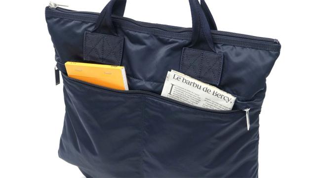 本体外側には縦長にデザインされたジップポケットを2ヶ所装備。メインルーム内で紛れてしまいがちな小物や、使用頻度の高いアイテムの収納に便利です。マチ幅も適度に設けられ、収納力のあるつくりになっており、見た目のデザイン性だけでなく実用性の高さもポイントになっています。