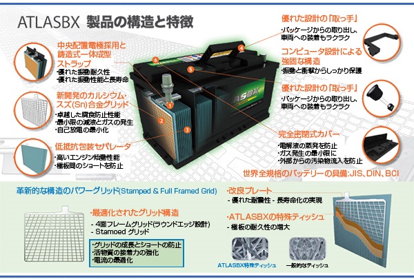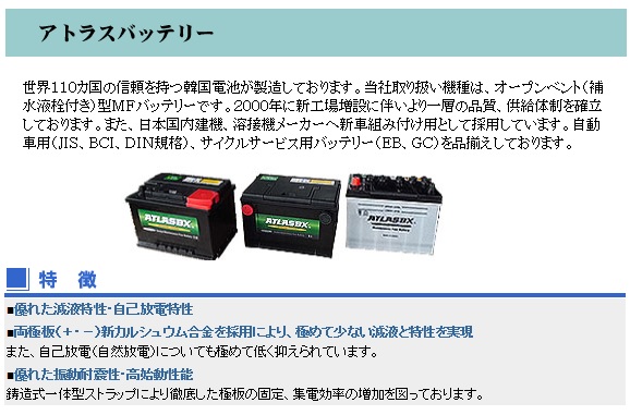 | ATLAS 自動車用バッテリーをコストパフォーマンスで選ぶなら、アトラスのバッテリーがおすすめ。 極めて少ない自己放電率と、スピーディーな始動性があなたに、快適なドライブをもたらします。 高いコストパフォーマンスを誇りながらも、長寿命で経済的なアトラスバッテリーのラインアップは、以下にてご覧いただけます。 ロングラン補償・・・24ヶ月または走行距離4万Kmまでの製品補償付き | |||||||||||||||||||