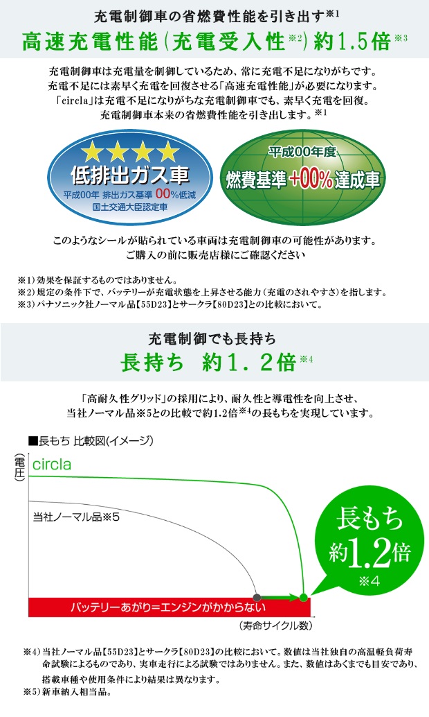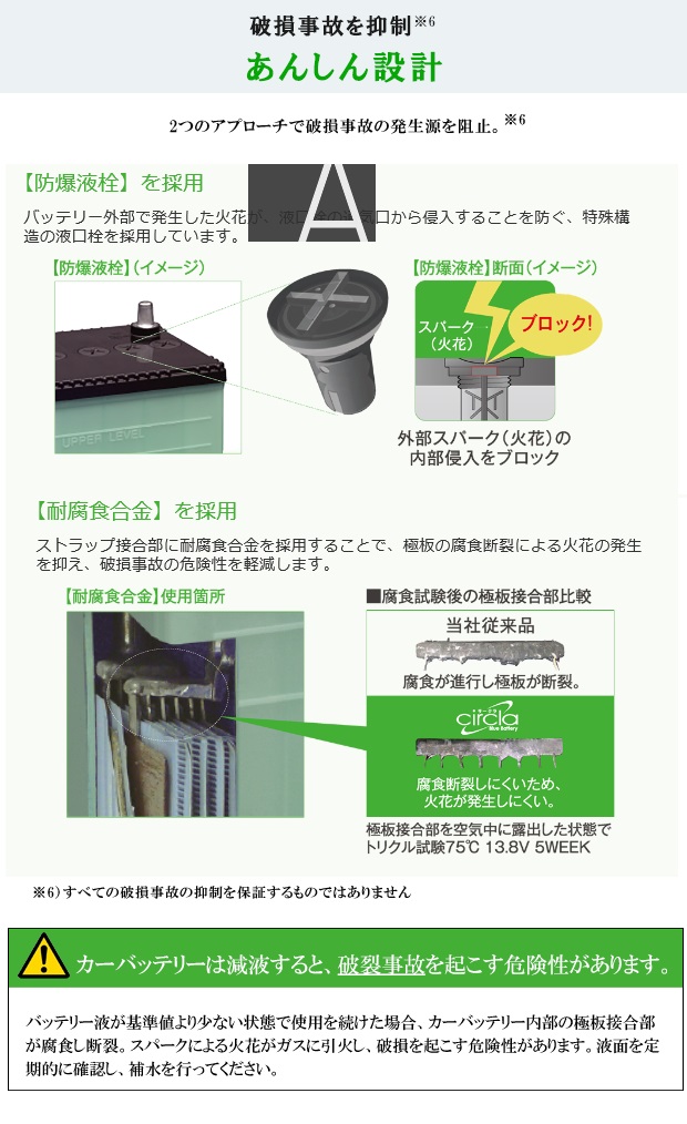 | 補償期間 | ご購入後より 36ヵ月または6万kmまでの製品補償 ※エンジン始動用以外の用途に使用しないで下さい。 ※充電回復する単なる放電状態(バッテリーあがり)は、補償対象外となります。 補償を受ける場合は、検査・点検を行いますのでお日にちが必要となります。 (代替品は行っておりません) |