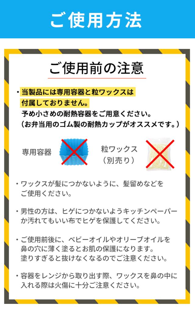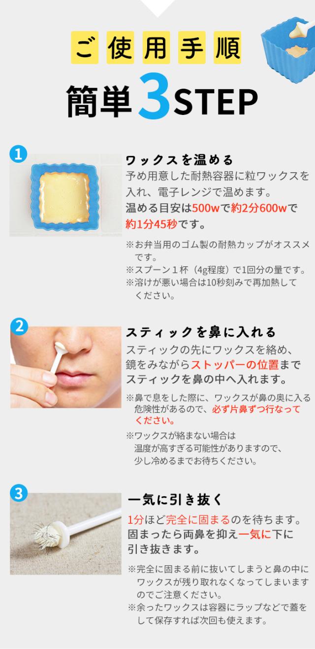 鼻毛ワックス脱毛専用スティックです。先端はワックスが絡みやすいような形状になっています。また、ストッパーがついているので、鼻の奥にスパチュラが入り込まないような仕様になっています。
