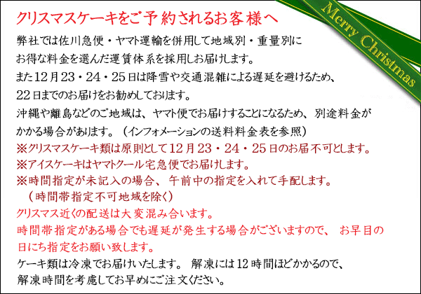 クリスマス時期は交通混雑や降雪の影響でご指定のお時間にお届けにならない事態が毎年のように発生しておりますので、早めの日時をご指定くださいますようお願いします。12月22日以前の着日指定をお勧めします。※12/23〜12/25のお届けは不可。