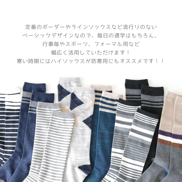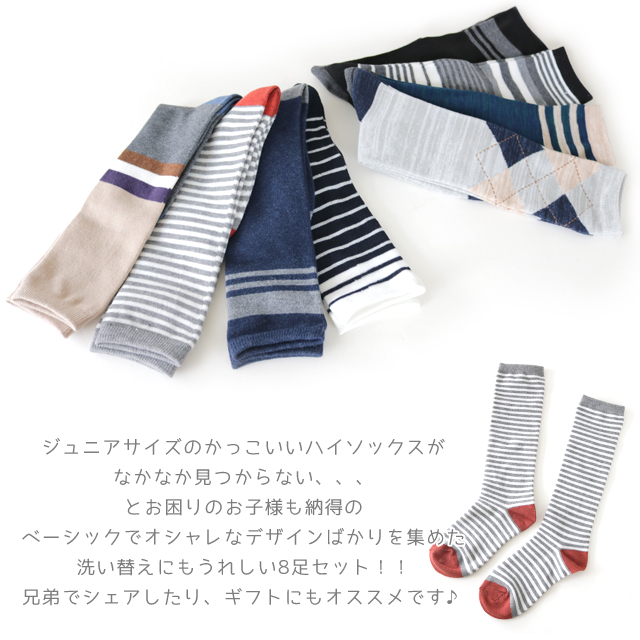靴下 キッズ ジュニア 男の子 ベーシックデザイン ハイソックス 8足セット 20-24cm対応サイズ【送料無料】 通学 フォーマル