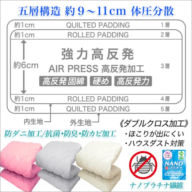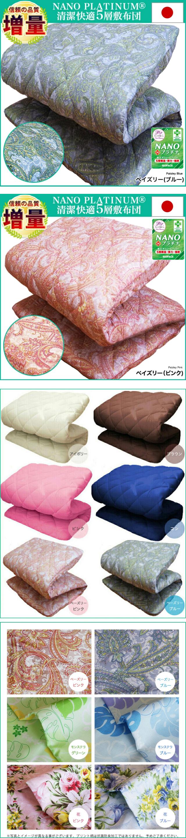 ニオイ対策・防臭/部屋干し臭抑制 日本製ふとん NANO プラチナ® 【Clean Keep 清潔さ長持ち】 ダブルクロス加工をしハウスダスト対策しております。また内生地には防ダニ加工、外生地には抗菌・防臭・防カビ加工をし安心で清潔な衛生加工を施してます。 【低ホルマリン基準クリア】当社の製品は薬剤等を使用しておりますが、身体に害になるような加工は一切しておりません。低ホルマリン基準をクリアした当社の製品は安心してお使いいただけます。 ◆固綿… 増量 【硬め/固め】 高反発加工の固綿に巻き綿を2重にかさねる事で、重さを1点集中しにくくしました。【国産】 |