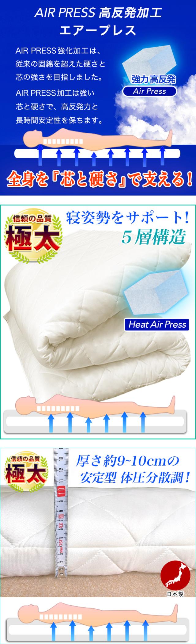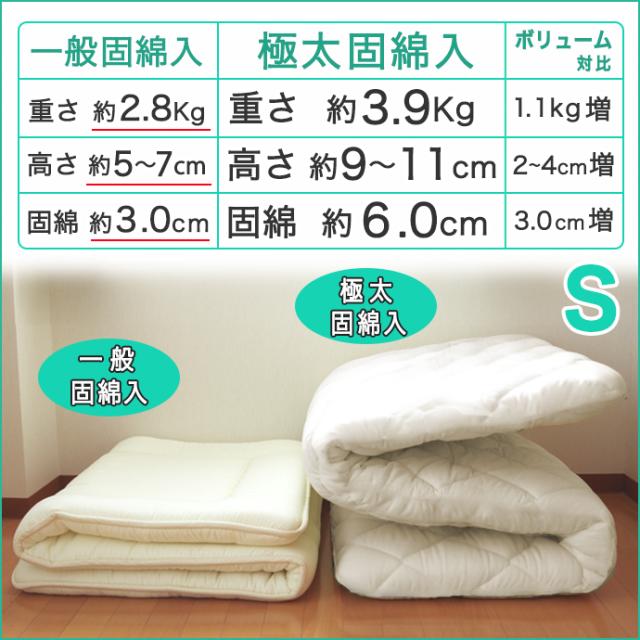 こちらの商品は【特殊固綿】を使用しております。特殊固綿の組成と致しまして、1本1本をストロー状態の極細繊維の綿を特殊工程により、膨らみを持たせ底付き感の軽減を施しております。また、素材の特性上、特殊固綿は特に湿気に弱く、そのまま放置した場合徐々に固綿がヘタり底付き感を感じる要因の一つと考えられます。また超固反発加工は生産工程により多少のサイズが異なる事が御座います。ご了承願います。御使用都度のお布団ケアを推奨とさせて頂いております。尚、一般的なお布団のケアと致しましては『陰干し』や『天日干し』等にて湿気をお布団に溜め込まない様にして頂くと少しでも長く御使用を続けていただく事が可能な場合がございます。