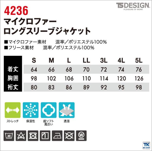 TS DESIGN 長袖防寒ジャケット 秋冬 防寒着 ジャケット 防寒服 ブルゾン 保温性 マイクロファー マイクロフリース スポーツ アウトドア ジャンパー 長袖 tw-4236
