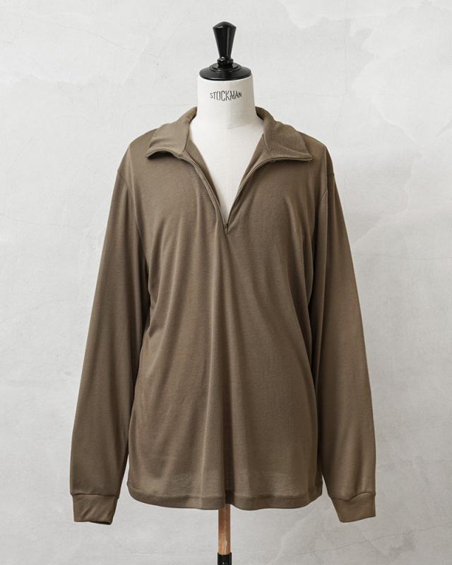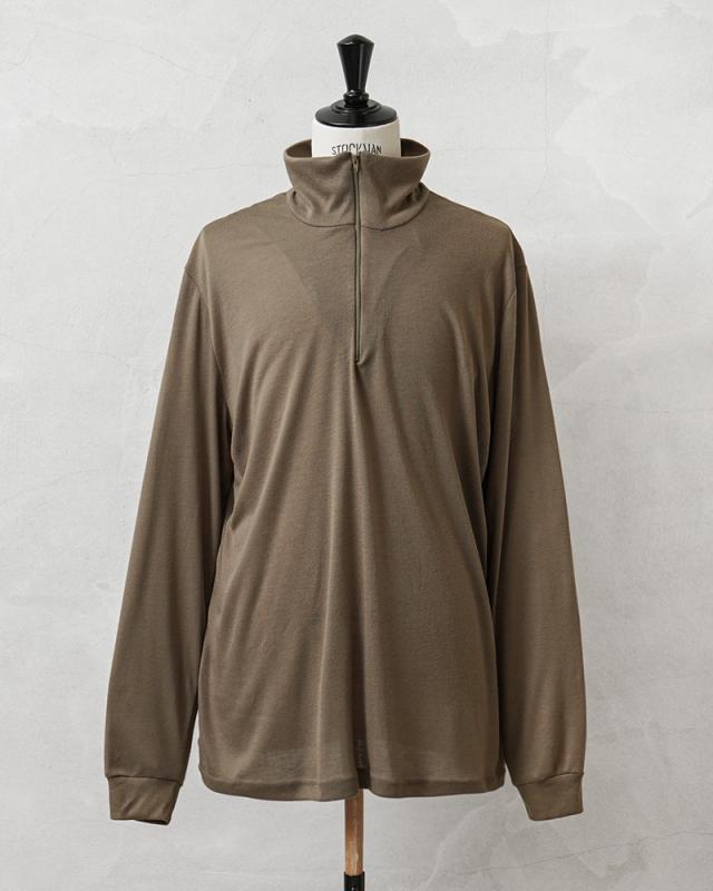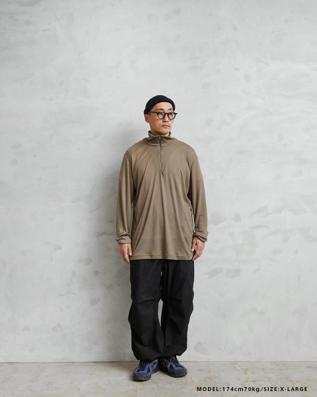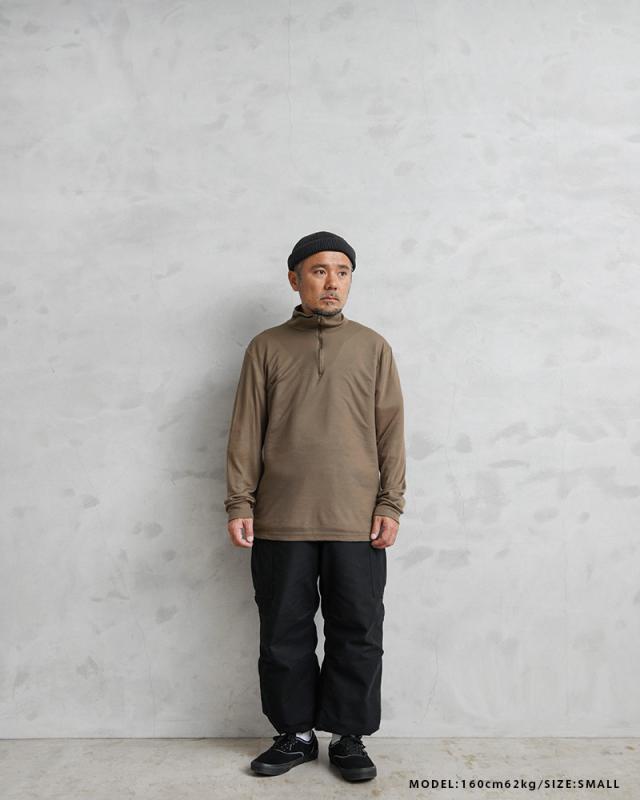 米軍より伸縮性があり肌触りの良い素材で、ハーフジップのアンダーシャツが登場しました。ベースレイヤーとしての防寒性はもちろんのこと、薄手ポリエステル素材なので、洗濯しても乾きが早く、汗をかく季節、登山やトレッキング時にも活躍します。アンダーシャツとしては珍しいスタイリッシュなデザイン。家でのリラックス時やワンマイルウェアとしての着用、タウンユースでもさりげないミリタリースタイルが楽しめるオススメのアンダーウェアです。