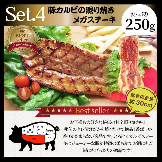 | ◇産地 | ◇牛肩ロース(タレ無し):アメリカ又はオーストラリア産 ◇スパイシーガーリックステーキ:アメリカ又はオーストラリア産 ◇ハラミステーキ(タレ漬け):アメリカ又はメキシコ又はカナダ又はオーストラリア産 ◇豚カルビステーキ(タレ漬け):デンマーク又はカナダ又はスペイン又はオーストリア又はアイルランド又はブラジル産 |