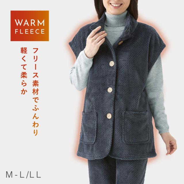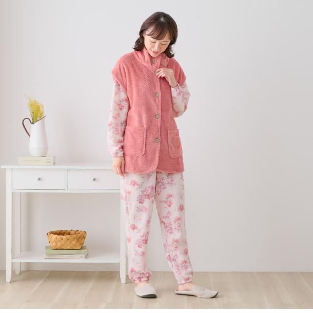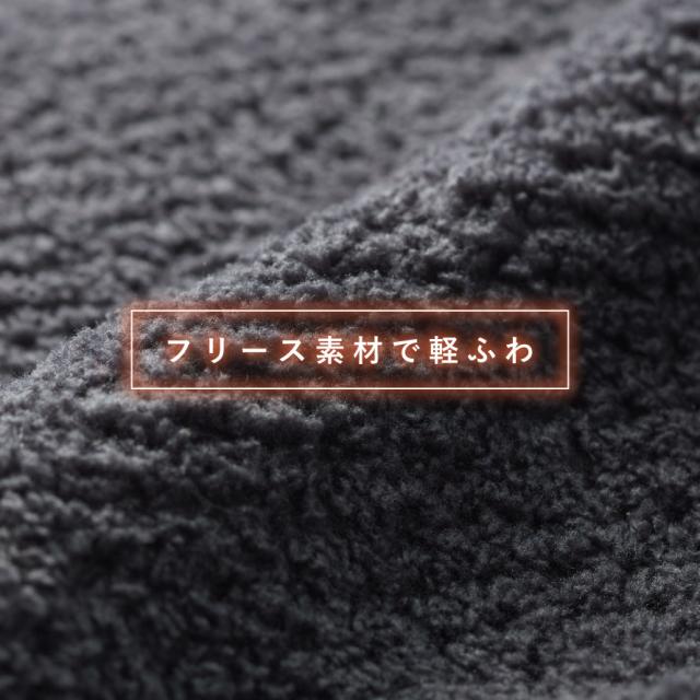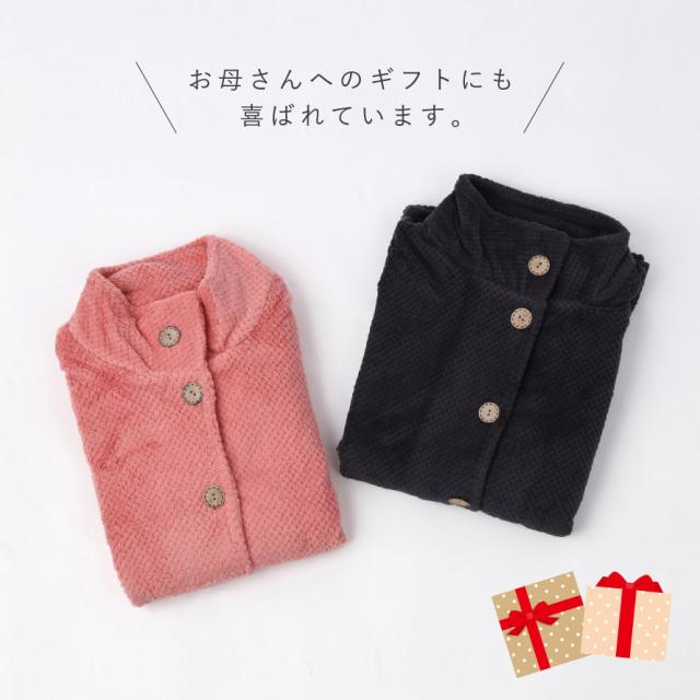 ふわっと軽いフリース素材で、見た目も着心地もあったかい、パジャマの上からも重ね着可能なルームウェアです。首もとも閉めればハイネックになり、肩先までカバーしてくれるので動きやすく暖かい。
