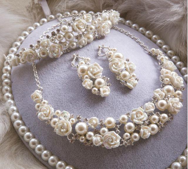 【即納】新作入荷☆結婚式、花嫁アイテム、ブライダルアクセサリーのネックレス&ピアスorイヤリング&ティアラの3点ホワイトローズモチ
