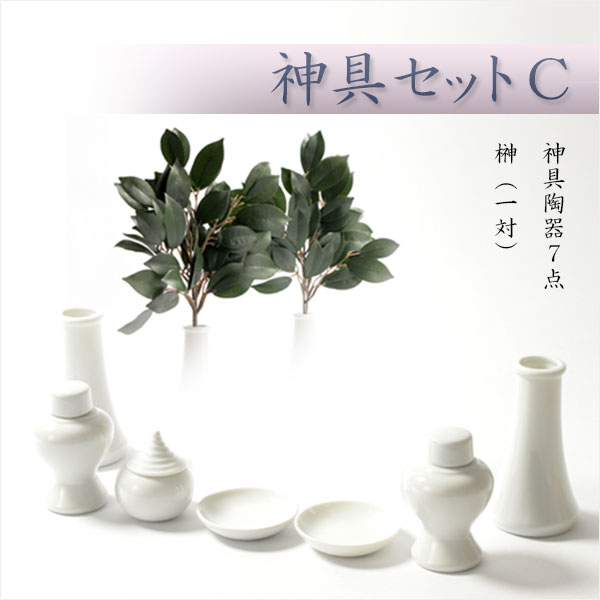 神具・神棚【神具セットC:榊一対・陶器神具7点】祖霊舎 神徒壇 神道 御霊舎 霊璽 御霊代 送料無料