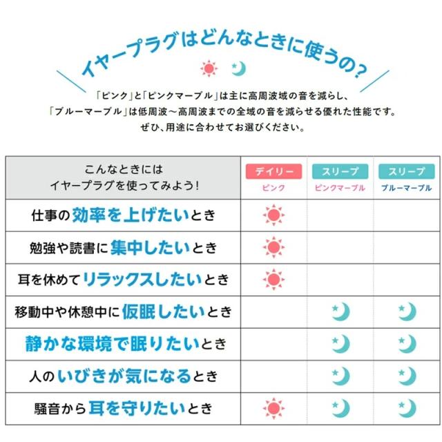 ピンクマーブル(遮音値30dB)は日常のリラックスタイムに、ブルーマーブル(遮音値32dB)は週末などゆっくり眠りたい時におすすめ。