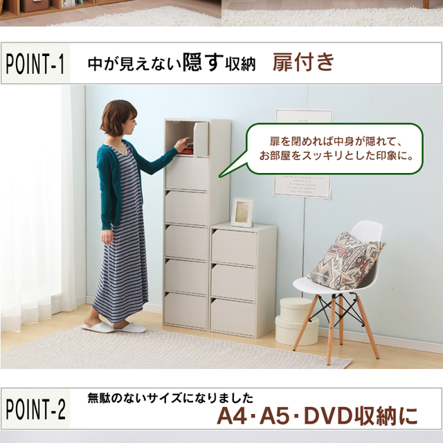 扉付きで収納物を隠せるので、生活感を出さず、お部屋をスッキリと見せます。