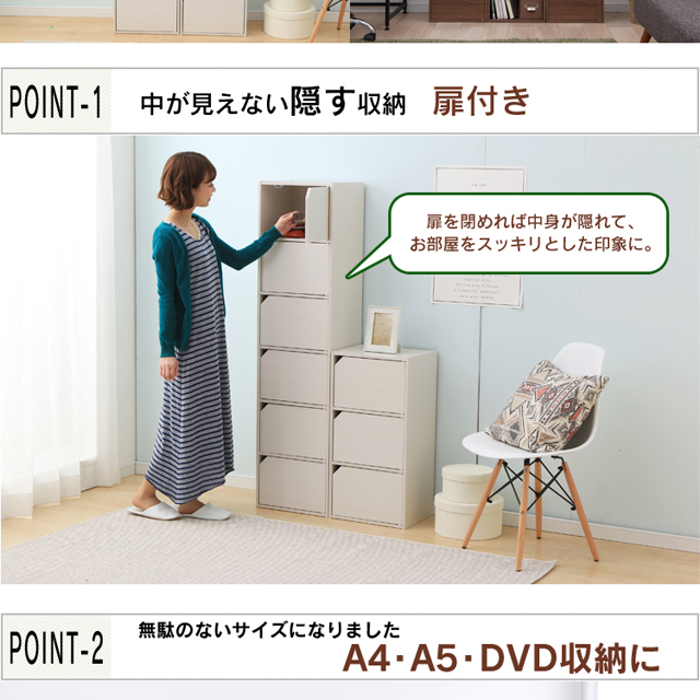 扉付きで収納物を隠せるので、生活感を出さず、お部屋をスッキリと見せます。