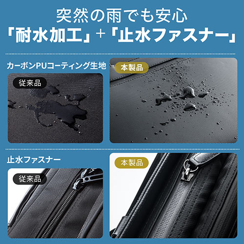水を弾くカーボンPUコーティング生地と水の染み込みを防ぐ止水ファスナーが荷物を守ります。