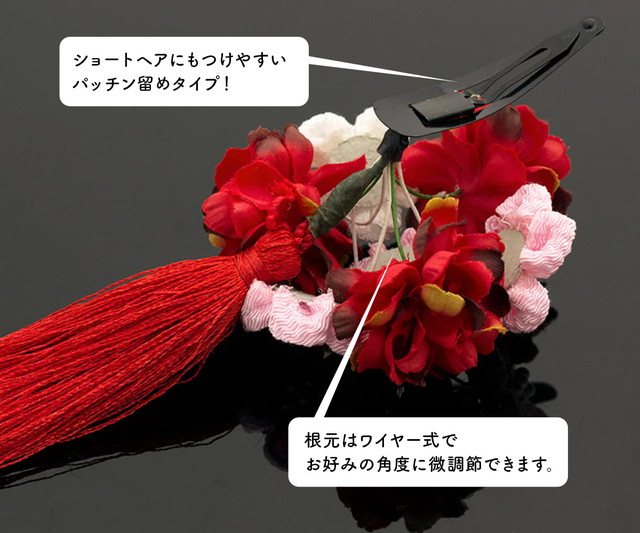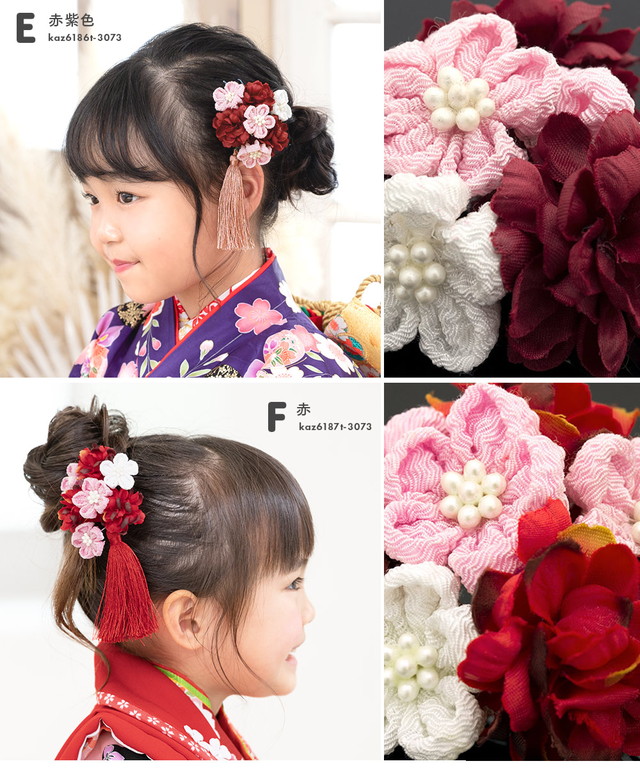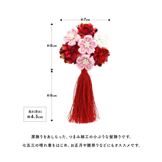 髪飾り 七五三 3歳 7歳 赤系 レッド ピンク 梅 花 コサージュ 小ぶり 縮緬 ちりめん つまみ細工 スリーピン パッチン留め 房飾り タッセル 髪留め ヘアアクセサリー 和装