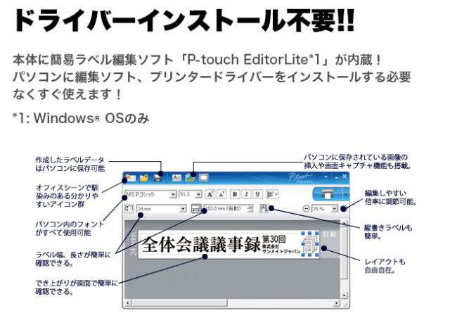 | ラベル作成ソフトウェア | P-touch Editor5.2※ ※本製品にはCD-ROMが同梱されておりません。インストーラーダウンロードページ(brother.com/inst/ja/)からソフトウェア/ドキュメントインストーラーをダウンロードして、パソコンにインストールしてください。 |