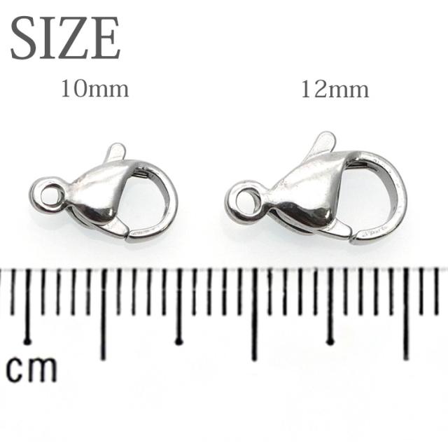 サージカルステンレス製のアクセサリーパーツ、手作りアクセサリーのパーツに欠かせないカニカン(カニフック)です。サイズは10mm、12mmの2サイズよりお選び頂けます。ネックレスやブレスレットの先端に必要な留め具です。医療用にも使用されるサージカルステンレス製ですので、金属アレルギーの方も安心してご利用いただけます。