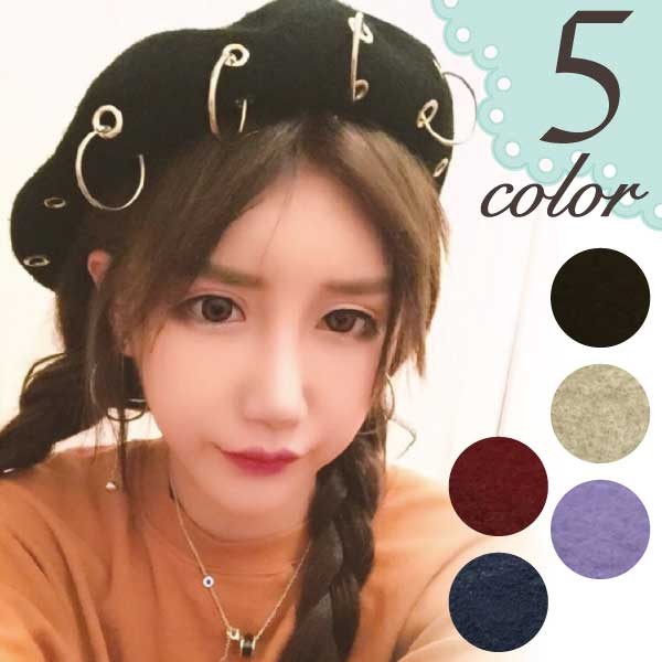 リング付き ベレー帽 帽子 ハット 羊毛 ウール ハトメ スタッズ 無地 可愛い レディース 秋冬 ミリタリー 軍事帽 韓国 870802