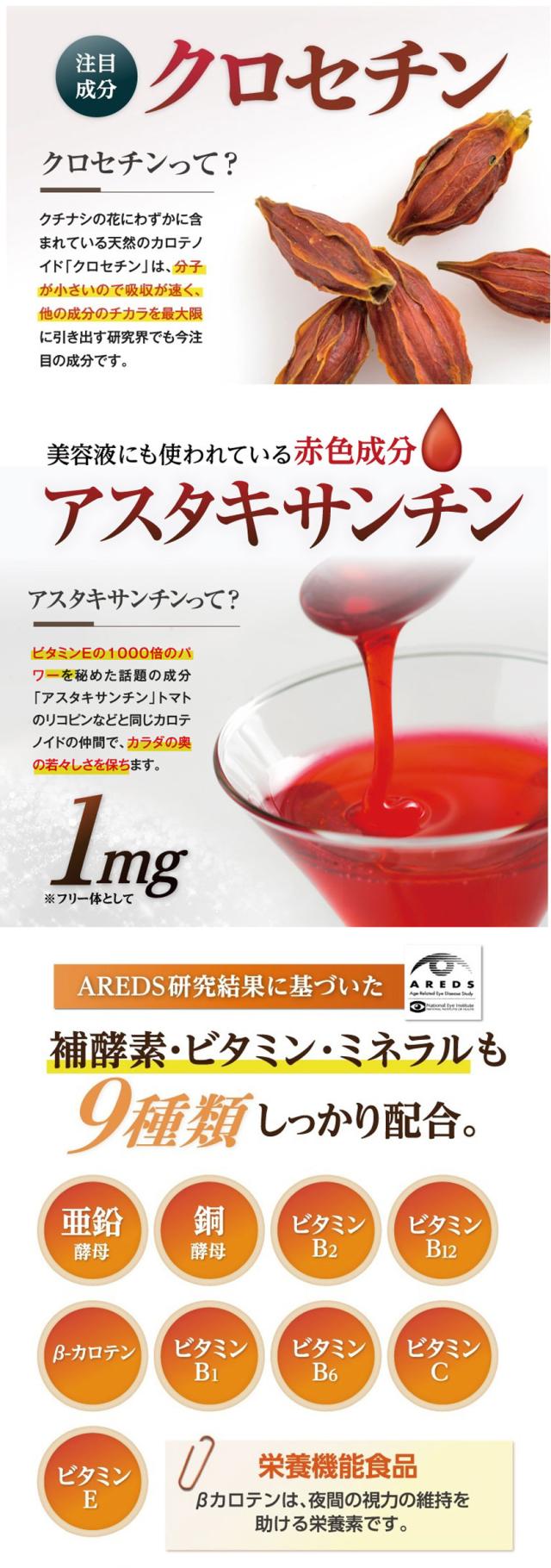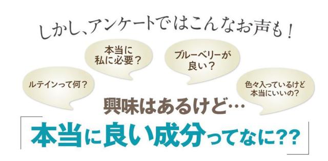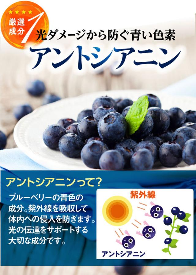 ビルベリーエキス、食用油脂、酵母(亜鉛含有)、酵母(銅含有)、カシスエキス、ゼラチン、植物レシチン、グリセリン、マリーゴールド色素、ビタミンE、ヘマトカッコス藻色素、ミツロウ、βカロテン、ビタミンC、ビタミンB2、ビタミンB1、ビタミンB6、クチナシ色素、ビタミンB12