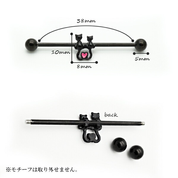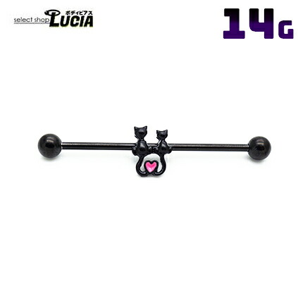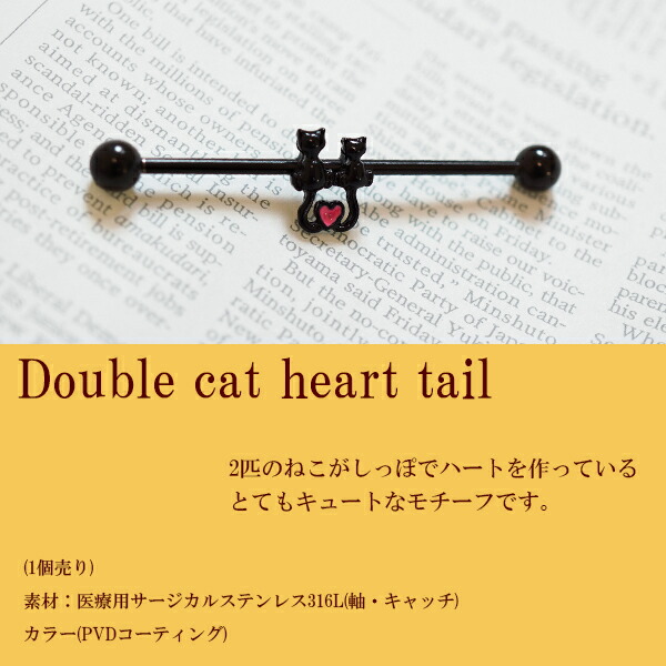 本日P2倍 14G ピアス ボディピアス 2匹の黒猫 しっぽ ストレートバーベル ロングバーベルハート インダストリアル 可愛い 金属アレルギー対応 316L 高品質
