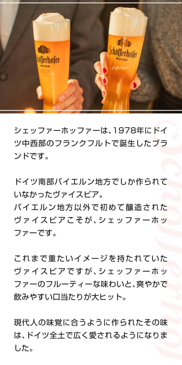 それまでのドイツ小麦ビールの重たいイメージを払拭するライトでフルーティーな小麦ビールを確立した由緒あるブランドです。オーストラリア国際ビール賞2001でグランドチャンピオンに輝いたのをはじめ、様々な国際コンクールでも賞を獲得している実力ブルワリーでもあります。「ルネサンス三大発明」のひとつである活版印刷術の発明者として知られる“ヨハネス・グーテンベルク”に従事した“ペーター・シェッファー”に由来する地ビールが、このシェッファー・ホッファーとなりました。(ラベルにペーターの肖像が掲げられています)1978年と比較的新しい銘柄ですが、それまで南ドイツ・バイエルン地方のものだけであったヴァイスビアをドイツ全土に広めたことで、その名声を勝ち取りました。