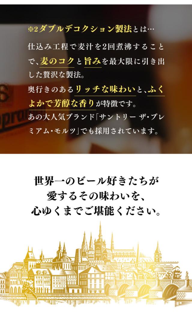 国別1人当りのビール消費量において18年連続世界一位を誇るチェコ共和国。ビール製造には古い歴史と伝統を持ち、世界中に出回っているビールの約80%を占めるというピルスナータイプの発祥の国としても有名です。そんなビール大国チェコの首都プラハを代表するビール「スタロプラメン」が、この度ついに日本上陸を果たします!日本での知名度はあまりありませんが、地元プラハで一番人気の地ビールで、製造量でいえばチェコトップクラスの実績。日本で人気のあるザ・プレミアムモルツと同じダブルデコクション製法で仕込まれ、麦本来の旨みやコクが楽しめる深い味わいが特徴です。世界で一番のビール好き達が選ぶプラハNo.1ビール「スタロプラメン」を、ぜひご堪能下さい♪