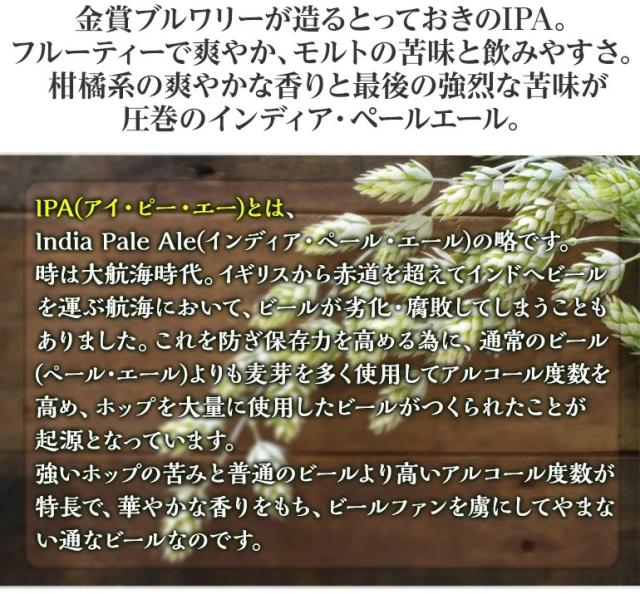 滋賀県北部長浜のクラフトビールブルワリー“長濱浪漫ビール”のIPA(上面発酵)。IPAとはIndia Pale Aleの略で大航海時代にビールが腐敗しないようにホップを大量に使用したのが起源。しっかりとした苦みを感じホップ由来の華やかな香りが愉しめます。ラベルモチーフは琵琶湖に沈む夕日をイメージしています。ビール単体で愉しめる個性が特徴です。
